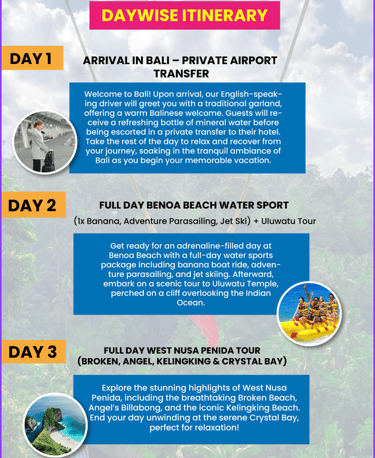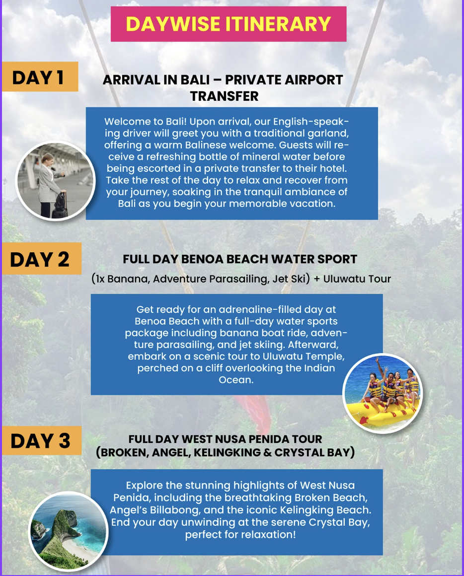 Experience an unforgettable getaway with a well-crafted tour package that begins with a romantic dinner on arrival, setting the perfect tone for your adventure. Over the next six days, explore breathtaking locations like Kintamani and Tegenungan Waterfall, enjoy snorkeling at Nusa Penida Island, indulge in exhilarating watersports, and unwind in a luxury villa, all culminating in a memorable departure filled with beautiful memories.